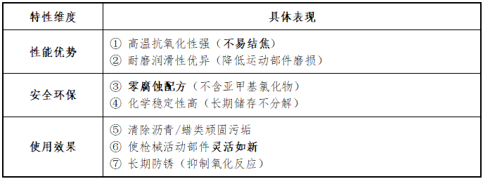 传统枪油需区分清洗剂(强溶剂除垢)、防锈油(成膜防蚀)、润滑脂(降低摩擦),维护流程繁琐。含氯溶剂(如亚甲基氯化物)残留导致精密部件锈蚀,尤其高温高湿环境下失效加速。单次维护实现“清洁-防锈-润滑”一体化,缩短保养时间50%以上(对标美军MIL-PRF-63460F标准)。