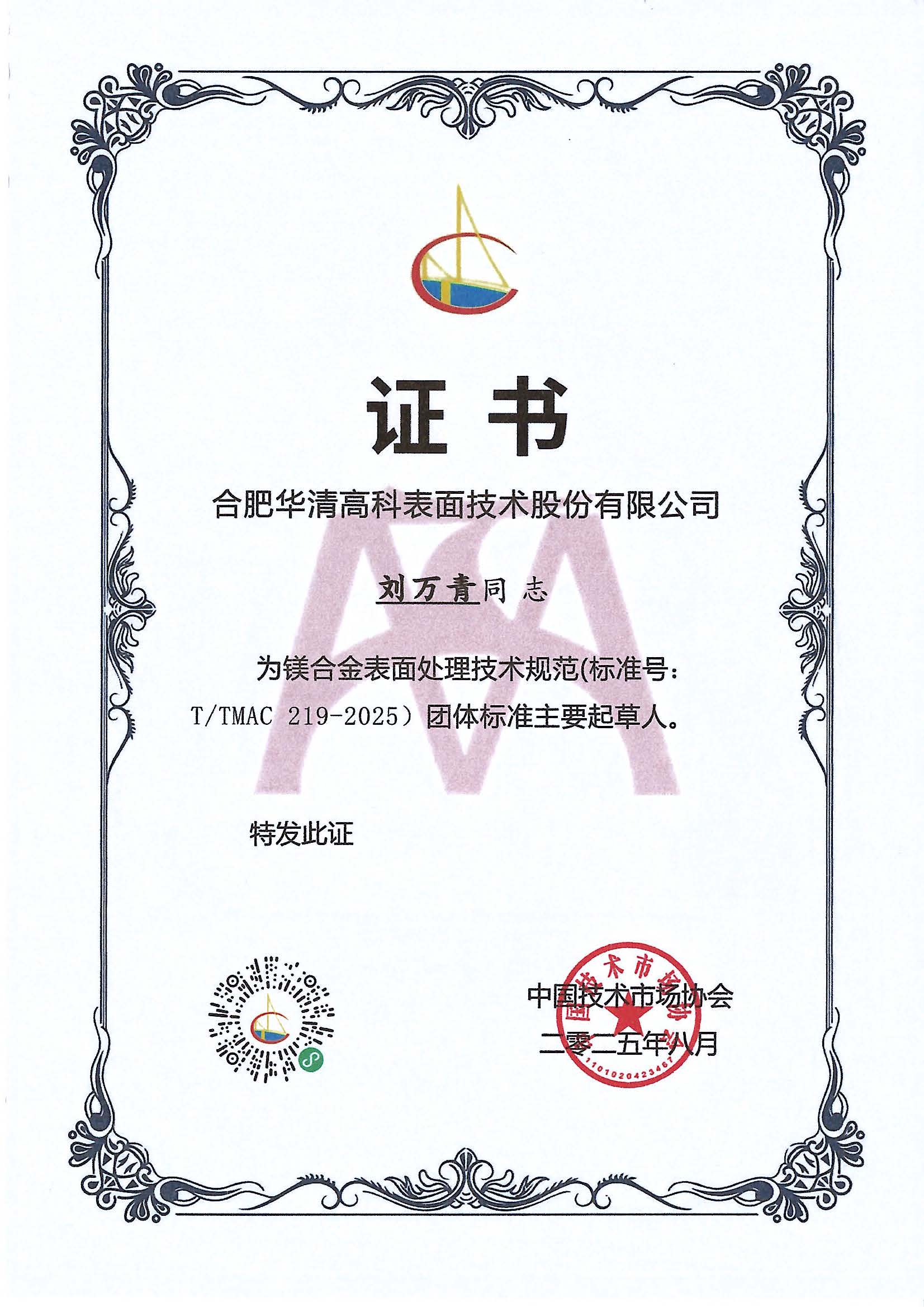 中国表面工程协会副理事长兼镁合金分会秘书长、合肥华清高科表面技术股份有限公司董事长刘万青担任镁合金表面处理技术规范(标准号:T/TMAC 219-2025)团体标准主要起草人。
