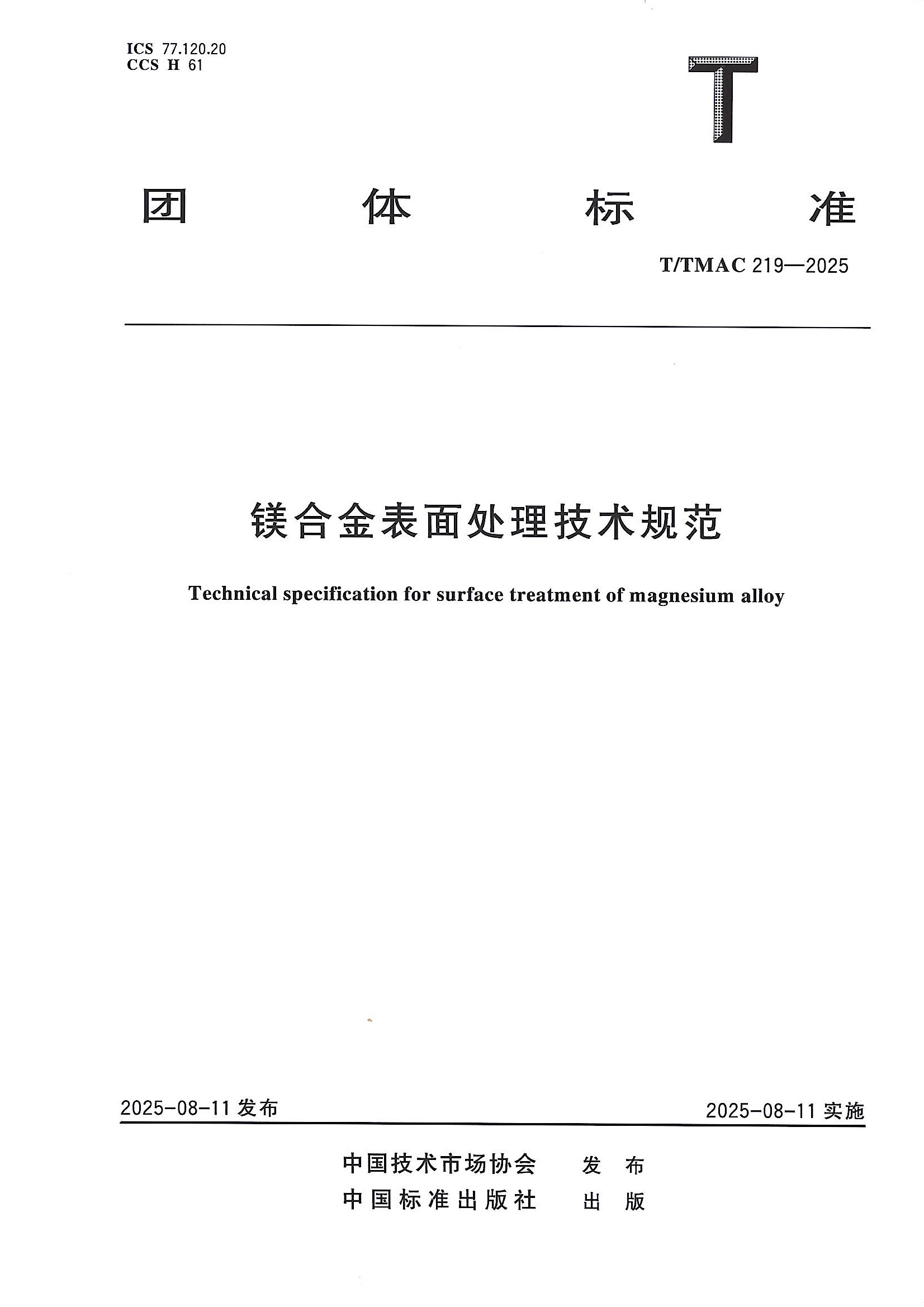 近日,由宝钢金属有限公司提出、中国技术市场协会归口的《镁合金表面处理技术规范》(标准号:T/TMAC 219-2025)团体标准正式发布。该标准严格依据《中国技术市场协会团体标准管理办法》《中国技术市场协会团体标准工作程序》制定和管理,将为镁合金表面处理行业提供统一的技术遵循,助力行业规范化、高质量发展。