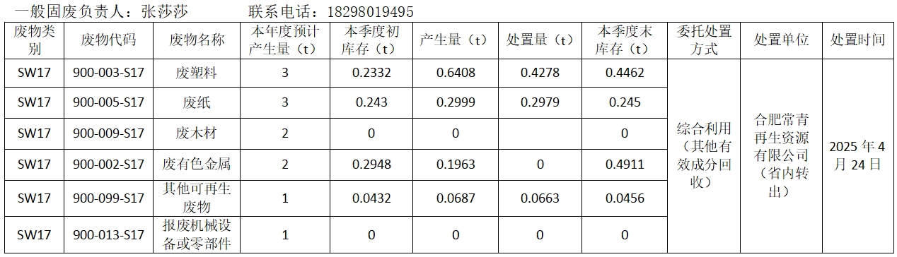 2025年第二季度一般固废产生、贮存和利用处置情况