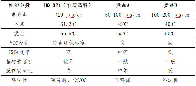 从上表可看出,HQ-321在电导率、闪点、环保性、清除效率及基材兼容性等方面全面优于市场主流产品,展现出其在新能源汽车清洗领域的技术领先性。