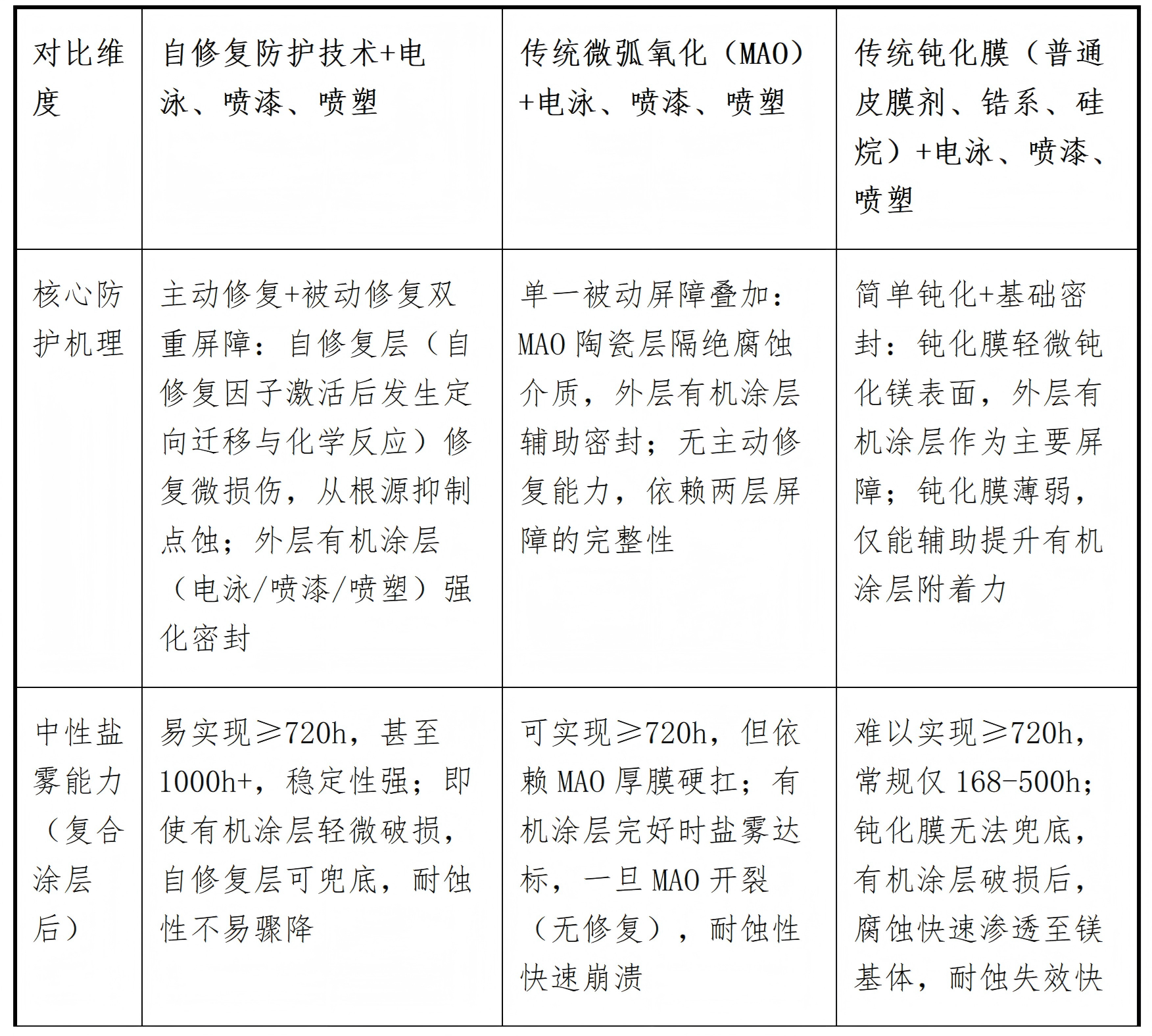 核心结论:三类防护技术与电泳、喷漆、喷塑搭配后,均构成镁合金复合防护体系,但防护可靠性、产业化适配性、失效风险差异显著——传统钝化膜+有机涂层(电泳/喷漆/喷塑)门槛低但耐蚀弱,传统MAO+有机涂层耐蚀达标但易隐蔽失效,自修复防护技术+有机涂层是唯一能突破镁合金产业化腐蚀痛点、兼顾耐蚀与可靠性的核心组合方案。以下从产业化关键维度,对三类组合方案做精准对比,全为工程化干货,可直接用于报告、选型参考。