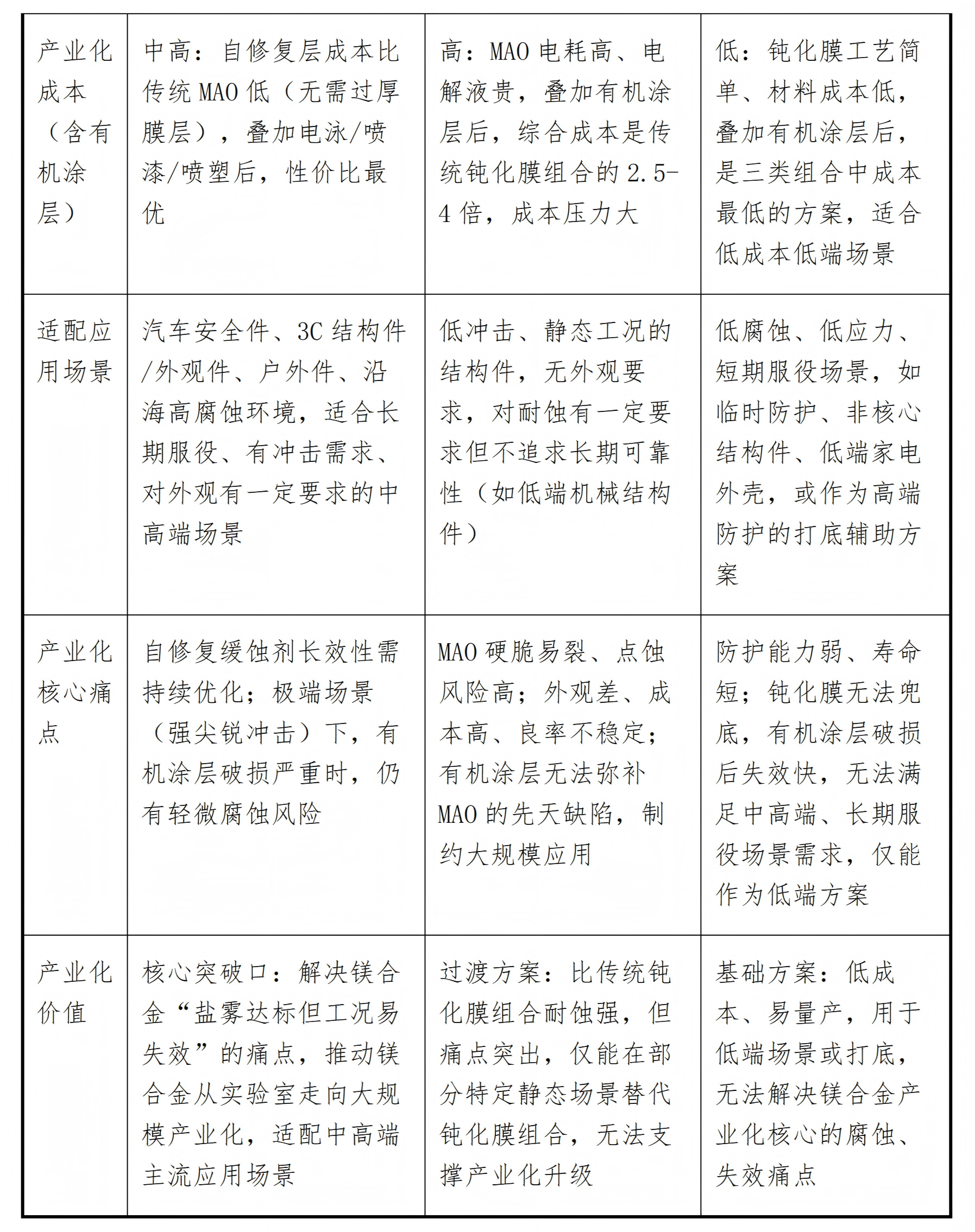 1.传统钝化膜+电泳(喷漆、喷塑):低成本、低防护、短寿命,仅能满足镁合金低端防护需求,有机涂层是主要防护屏障,钝化膜辅助作用有限,无法解决产业化核心的腐蚀与失效痛点,仅作为辅助或临时防护方案;